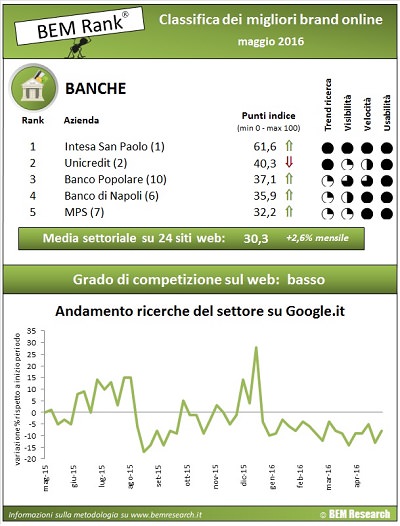 Intesa-SanPaolo mantiene la prima posizione tra i brand online nel settore bancario secondo i dati elaborati da BEM Research e relativi al mese di maggio 2016. Conferma il secondo posto Unicredit, mentre scala diverse posizioni, attestandosi al terzo posto, Banco Popolare, che trae giovamento anche dalle notizie sulla sua fusione con BPM. In miglioramento anche Banco di Napoli, banca del gruppo Intesa-SanPaolo, che dalla sesta posizione di aprile sale al quarto posto. Chiude la classifica dei cinque migliori brand bancari Monte dei Paschi di Siena. Escono dalla classifica Banca dell’Adriatico, altra banca del gruppo Intesa-SanPaolo, Banca Mediolanum e Cariparma.