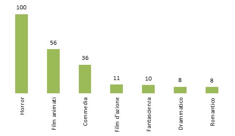 L’analisi delle ricerche online ci racconta di un popolo che preferisce il genere horror (grafico 3). In cima agli interessi seguono poi i film animati e le commedie. Più distanziati sono la fantascienza, il genere drammatico e quello romantico.